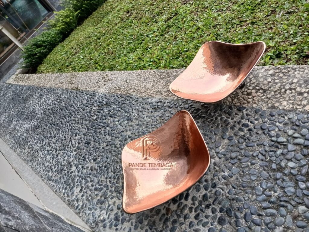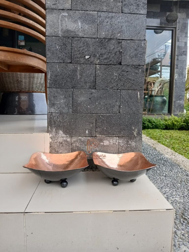 mangkuk/Bowl tembaga ini memiliki bentuk yang unik terlihat nemililki 2 finishing warna yang berbeda yaitu hitam dan warna tembaga sehingga menghasilkan kombinasi yang unik. permukaan bagian dalam memiliki pola bintik-bintik halus hasil tempaan tangan, menghasilkan pantulan cahaya. dilengkapi dengan kaki kaki penopang berbentuk bulat dibagian bawah. mangkuk unik ini terbuat dari bahan tembaga kualitas tinggi, dengan finishing poles mengkilap dibagian dalam dan cat/coating hitam dibagian luar.