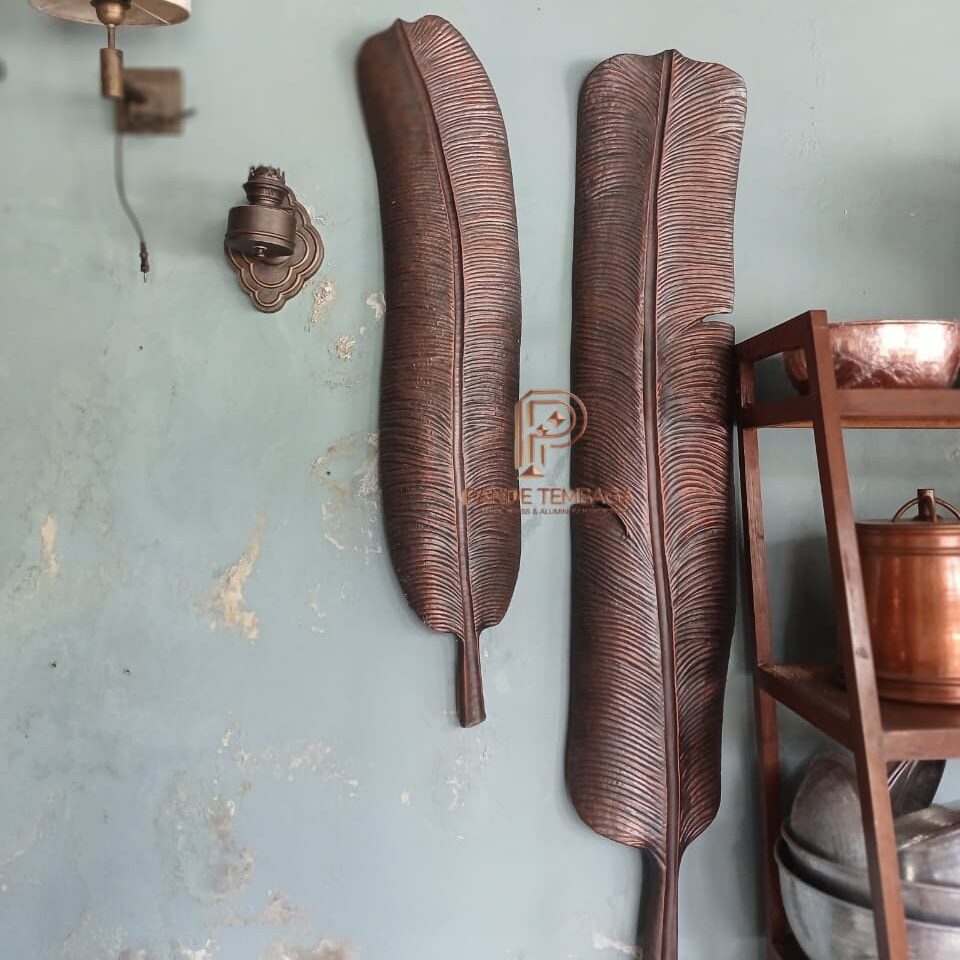 Hiasan dinding (walldecor) ini menampilkan keindahan seni kriya logam yang memadukan unsur alam dengan kesan industrial yang elegan. walldecor dengan motif sepasang daun pisang atau Banana Leaf ini dibuat dengan detail tekstur tulang daun dan serat yang sangat realistis.